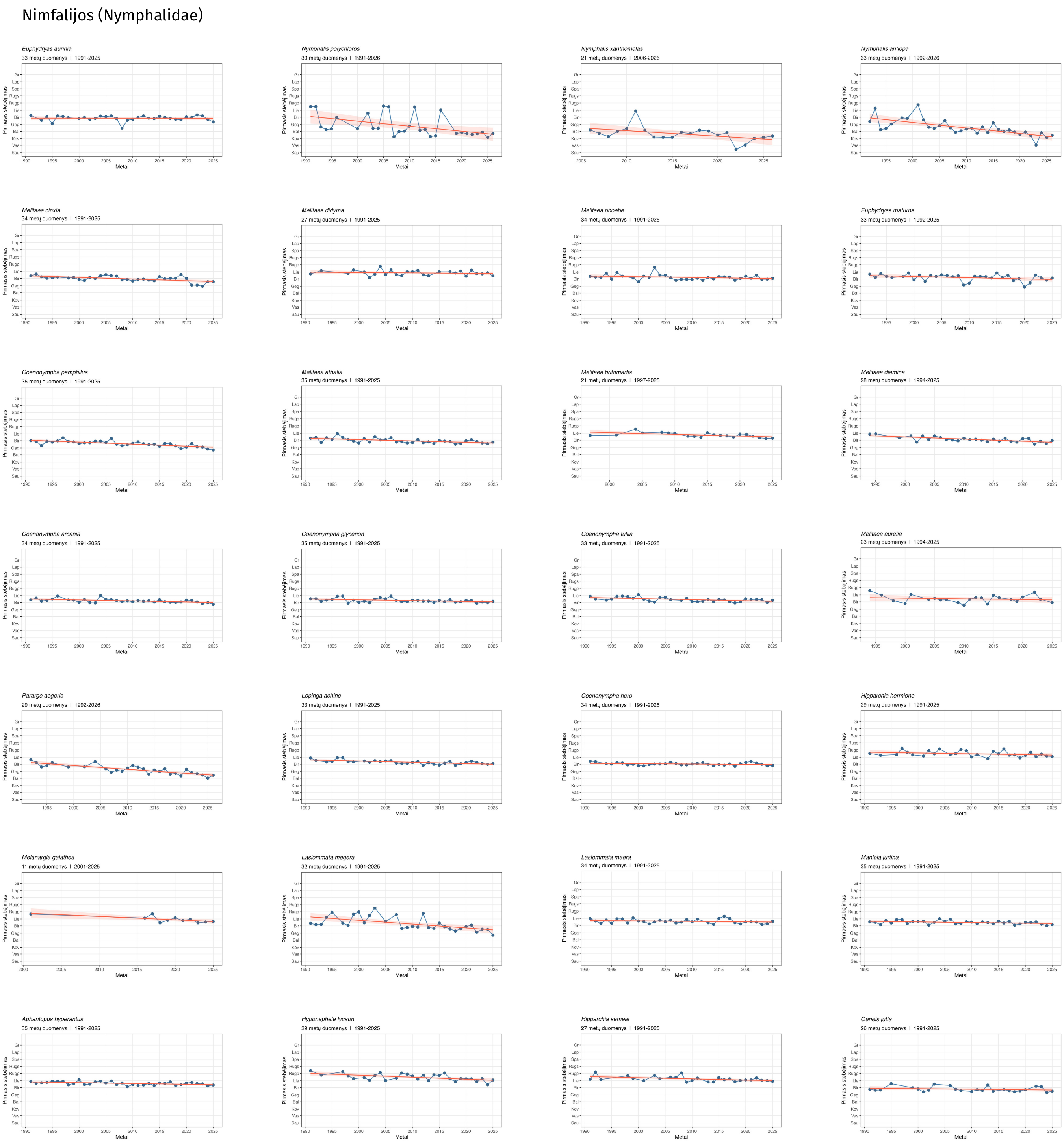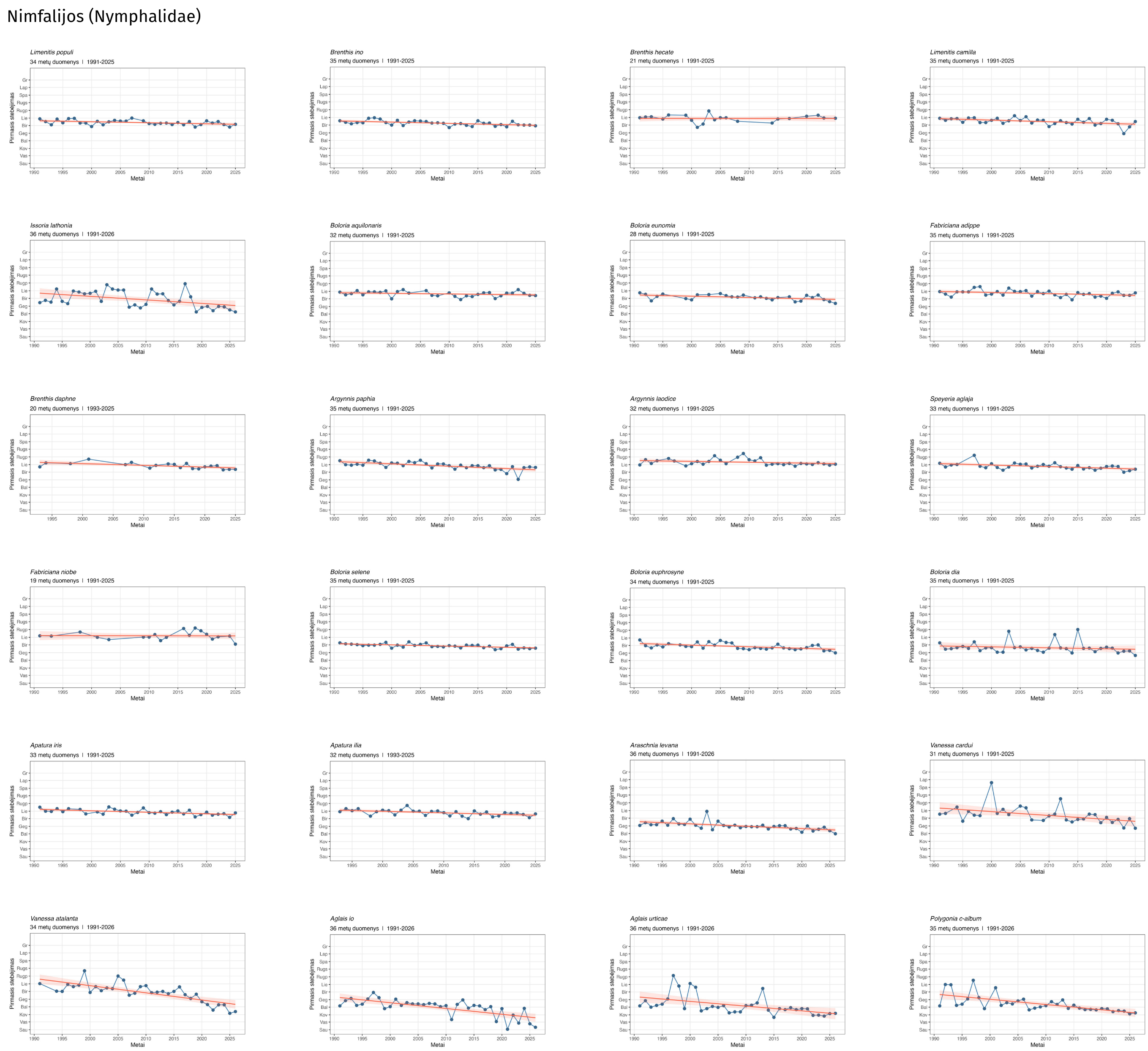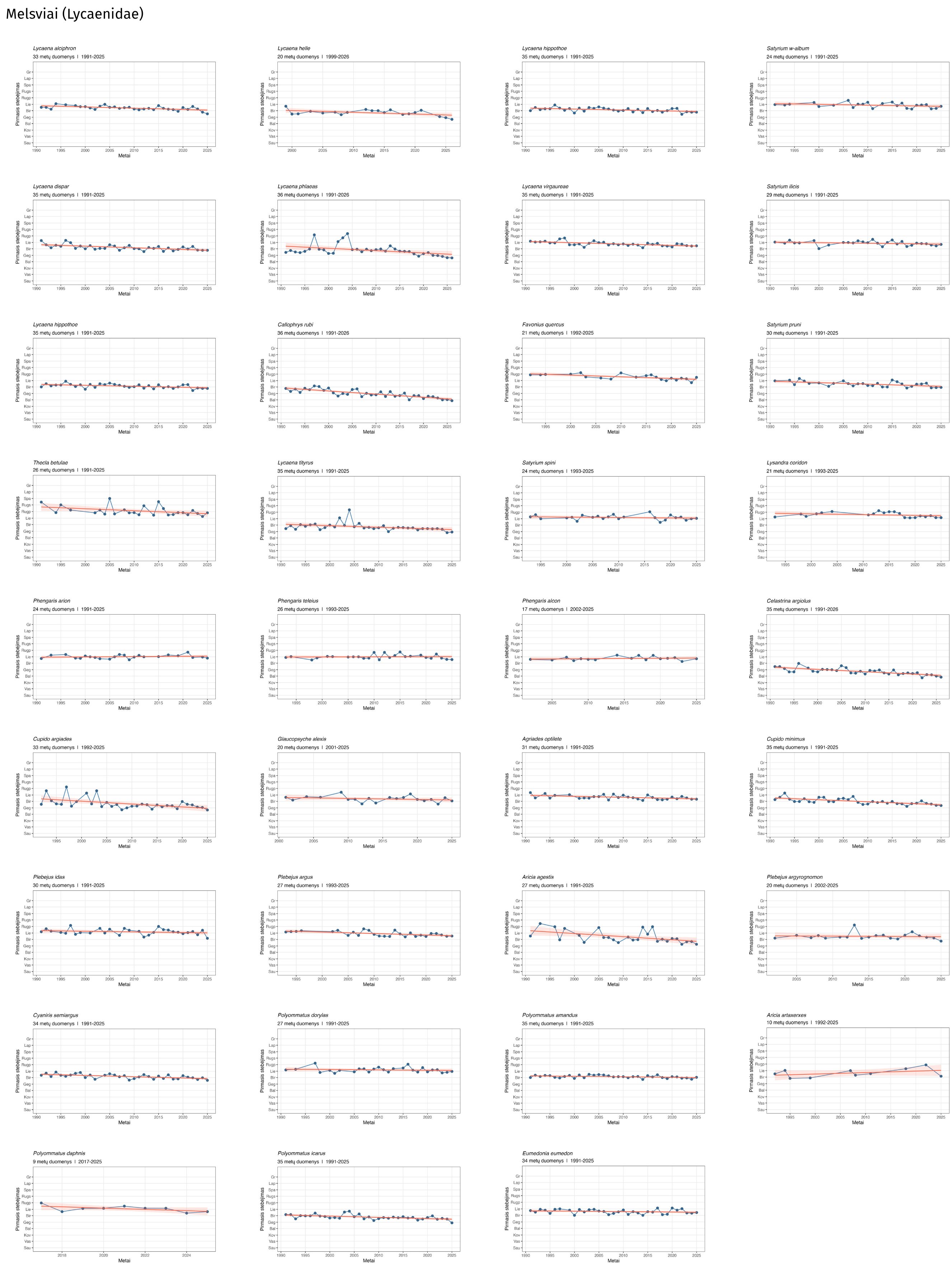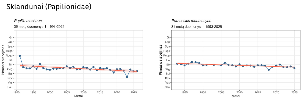 | Pyrgus malvae | Mažoji hesperija | 2026/04/14 | 2023/04/29 | 2024/04/30 | 2025/04/19 | 04/27 |